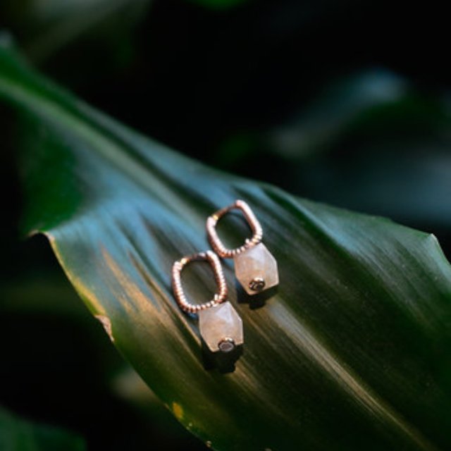 Ways Out Hong Kong | <Lustre> 〈Vibrant〉- Rose Gold Twisted Rectangle Earrings with Pink Small Pyramid Cube