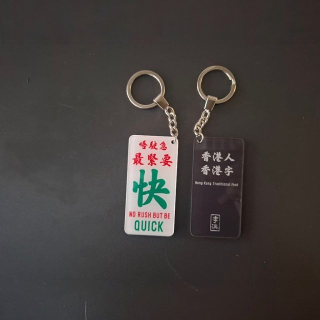 Lee Hon Kong Kai | Hong Kong illustrated keychain with famous quotes 唔洗急 最緊要快 NO RUSH BUT BE QUICK