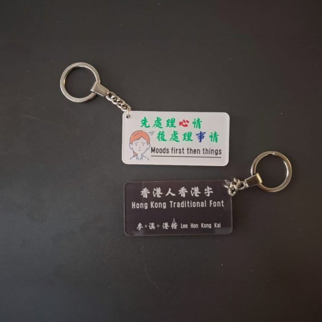 Lee Hon Kong Kai | Hong Kong illustrated keychain with famous quotes 先處理心情 後處理事情 Mood things then things