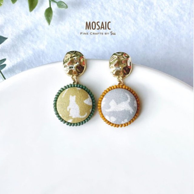 Mosaic~Fine Crafts by Su | Fabric with Metal Circle Earrings(Japan Cat)