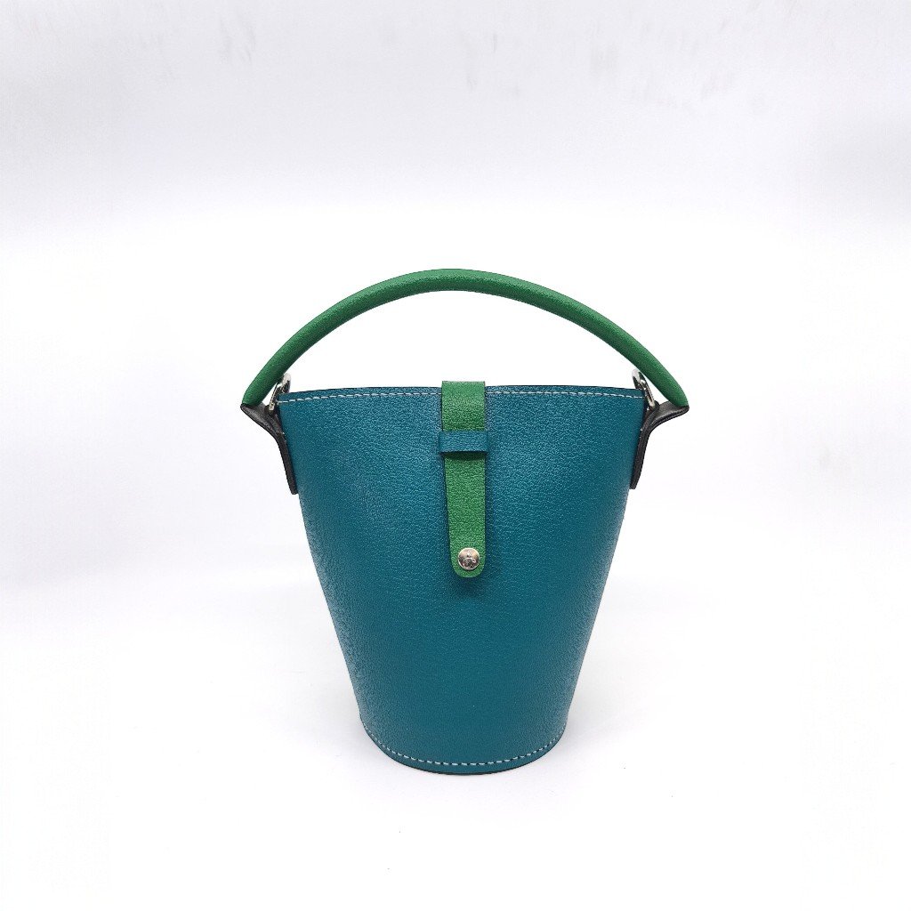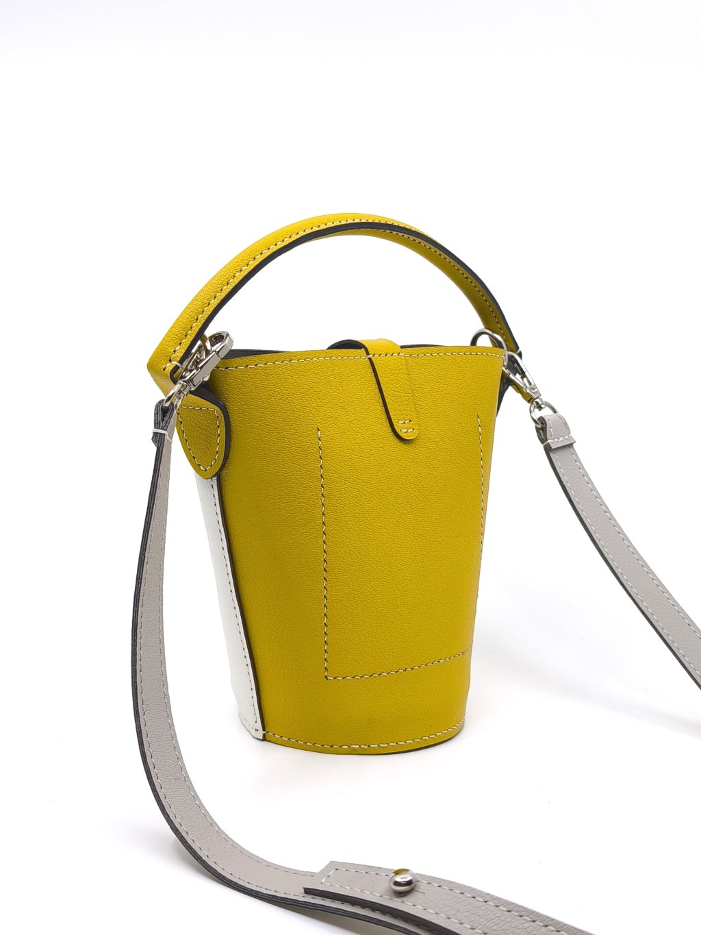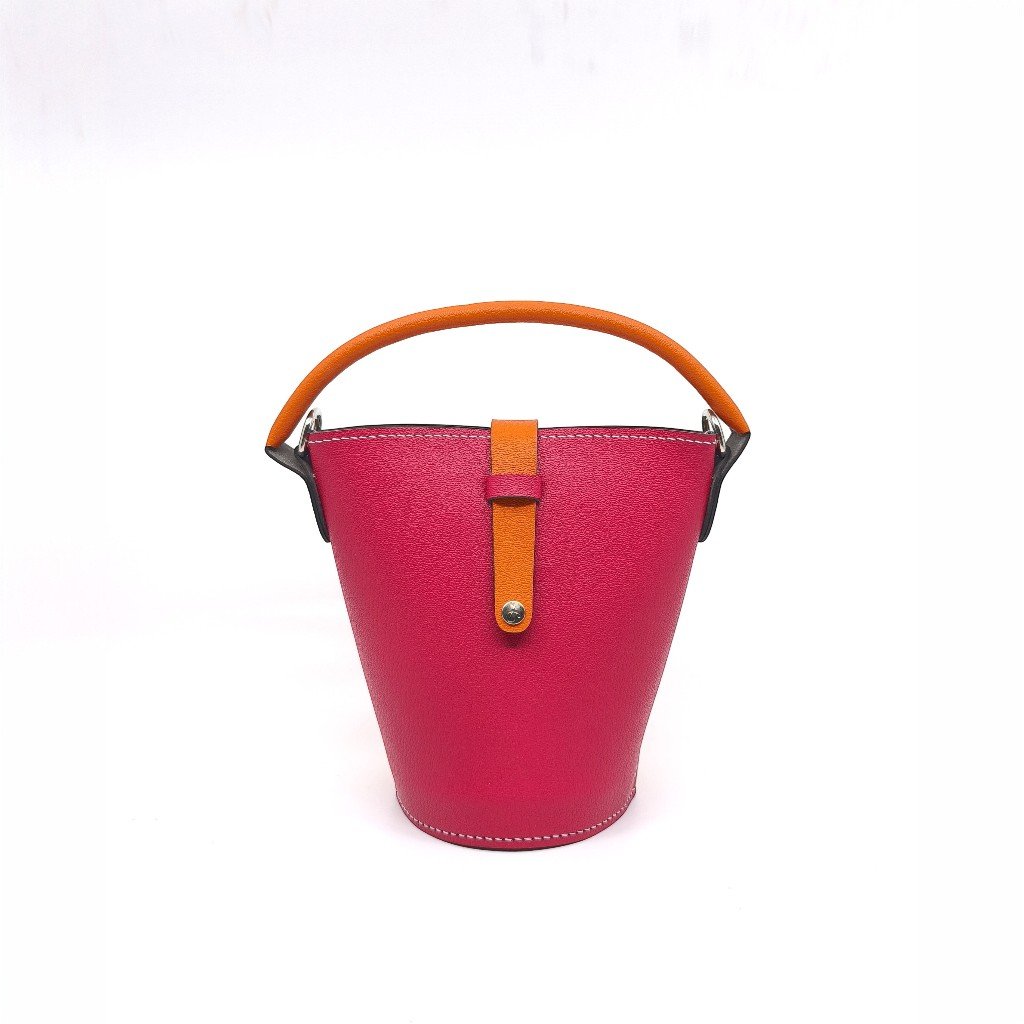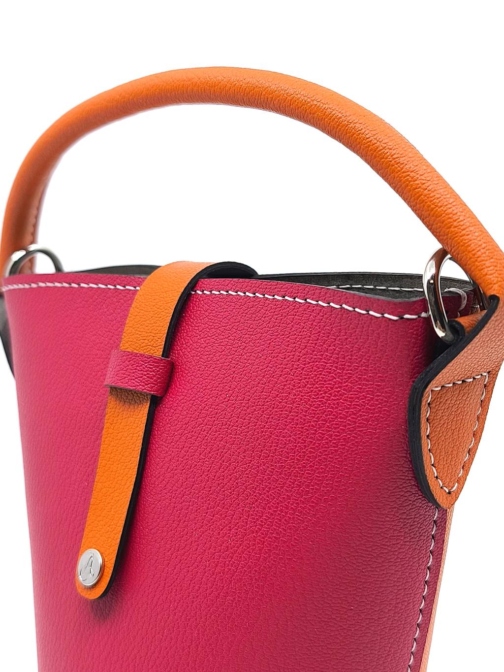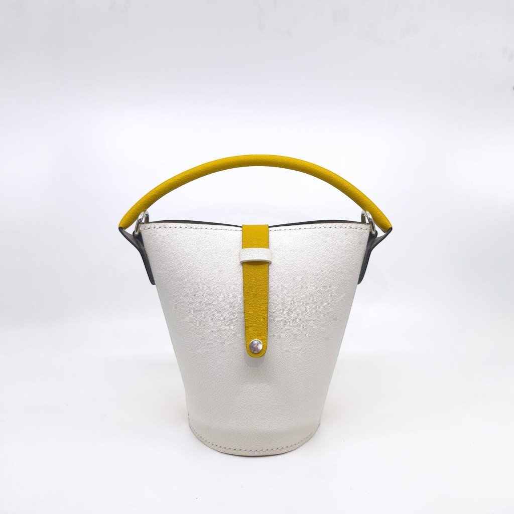 The bucket bag is compact and lightweight, with a tapered trapezoid shape that naturally flares outward on both sides, giving it a soft yet sharp silhouette. Its dual-tone color design on the front and back features summery hues that are easy to mix and match. The vertical leather drawstring, paired with a metal snap button, not only ensures secure fastening but also adds a touch of detailed style to the overall look.