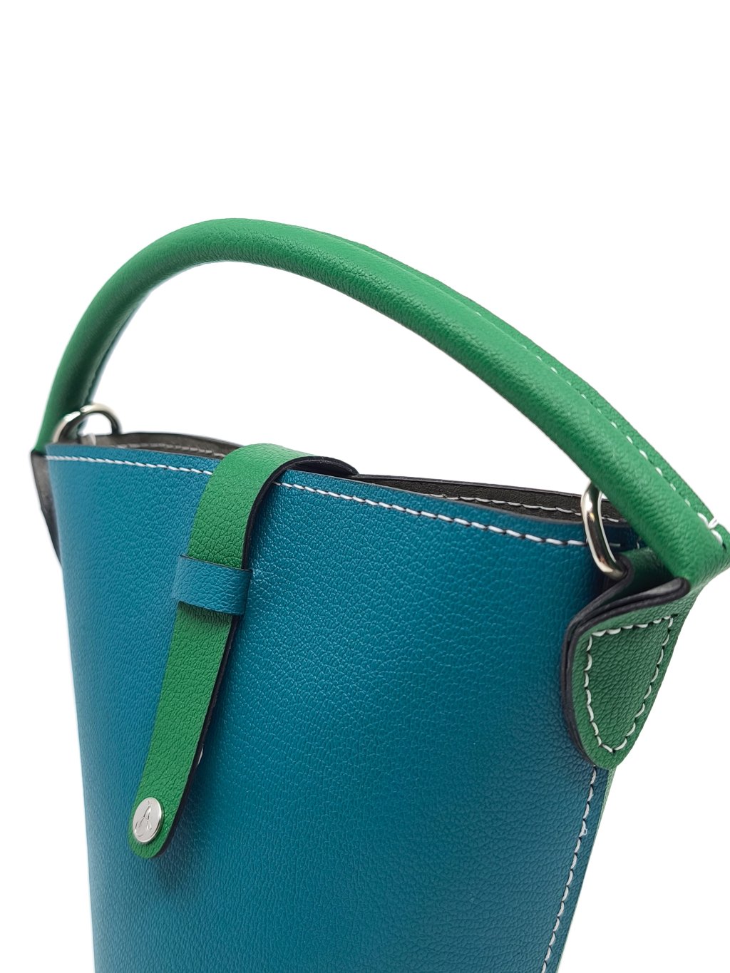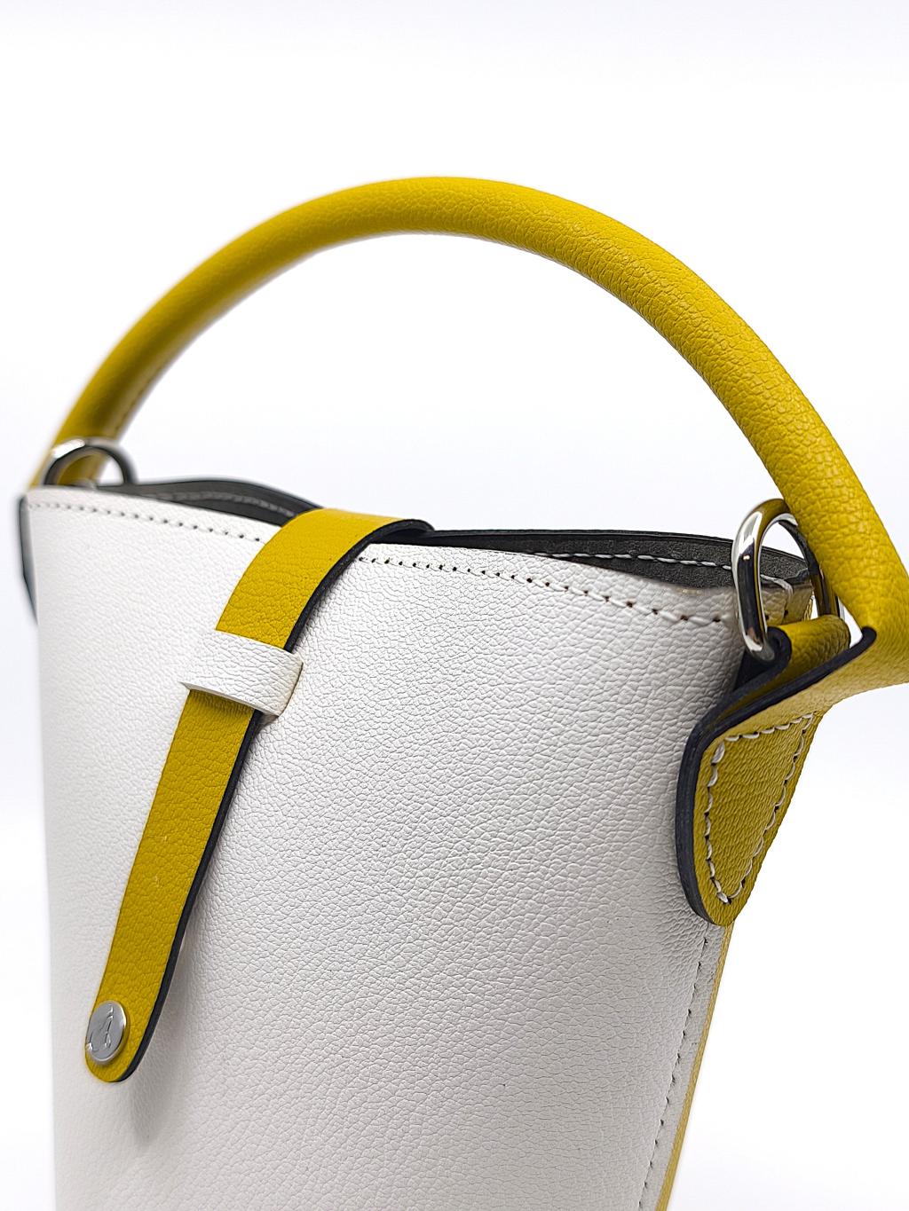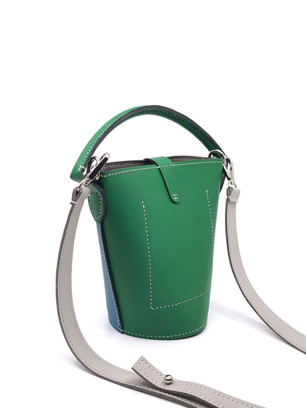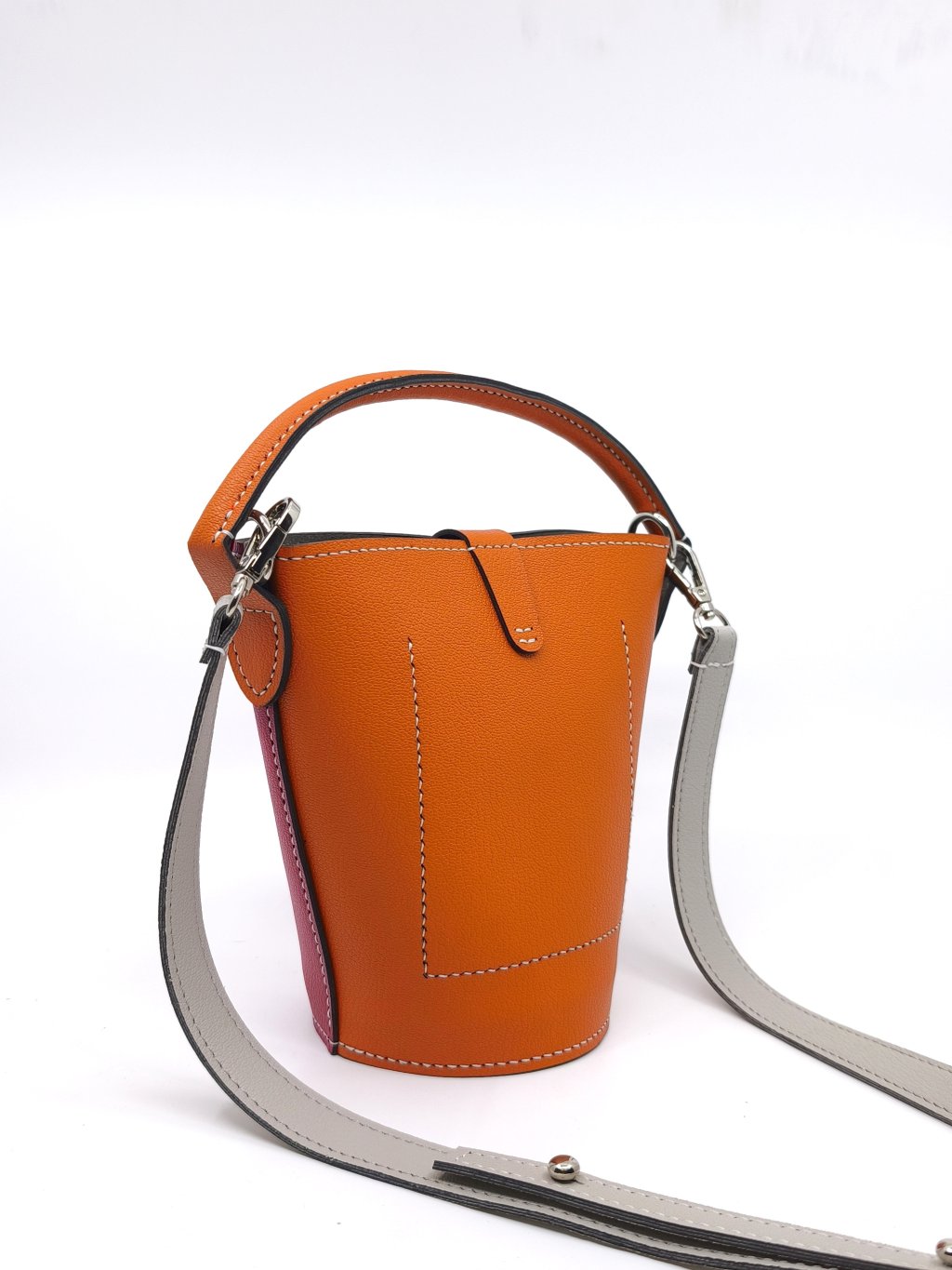 The bucket bag is compact and lightweight, with a tapered trapezoid shape that naturally flares outward on both sides, giving it a soft yet sharp silhouette. Its dual-tone color design on the front and back features summery hues that are easy to mix and match. The vertical leather drawstring, paired with a metal snap button, not only ensures secure fastening but also adds a touch of detailed style to the overall look.