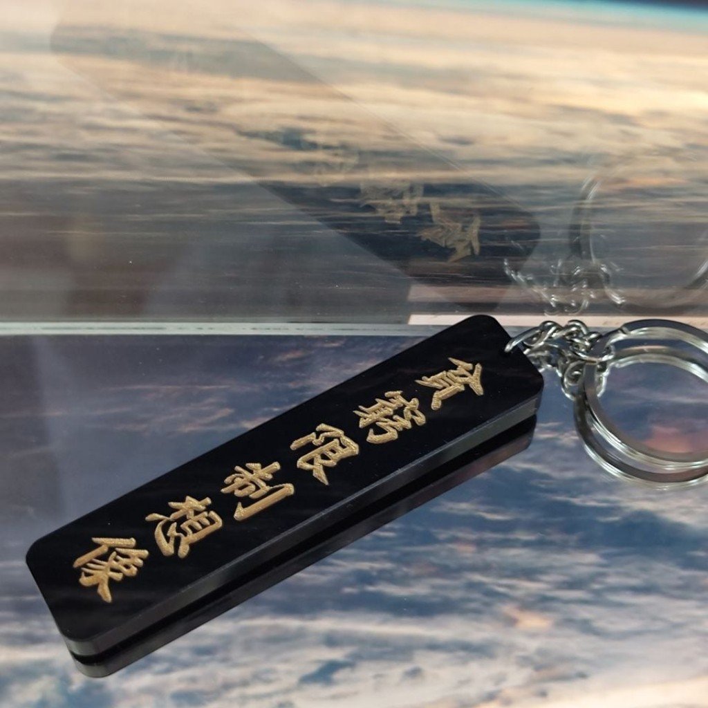 Black acrylic keychain with gold engraved text, single sided, size 90mm X 20mm, thickness 5mm