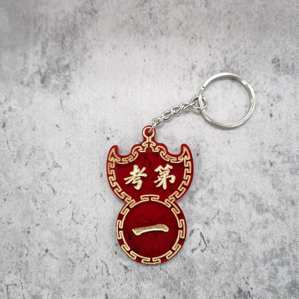 Engraved key chain with red transparent acrylic and hand-applied gold paint,size 60mm X 38mm