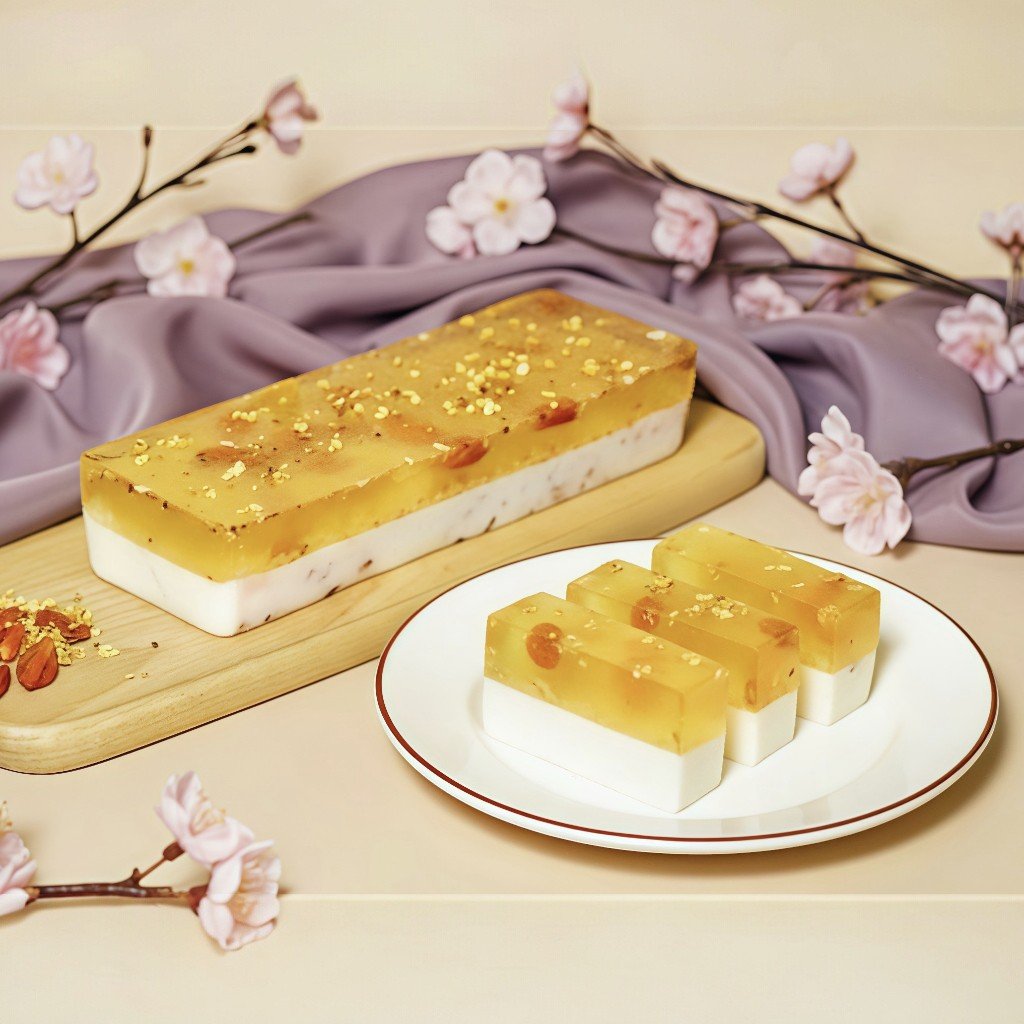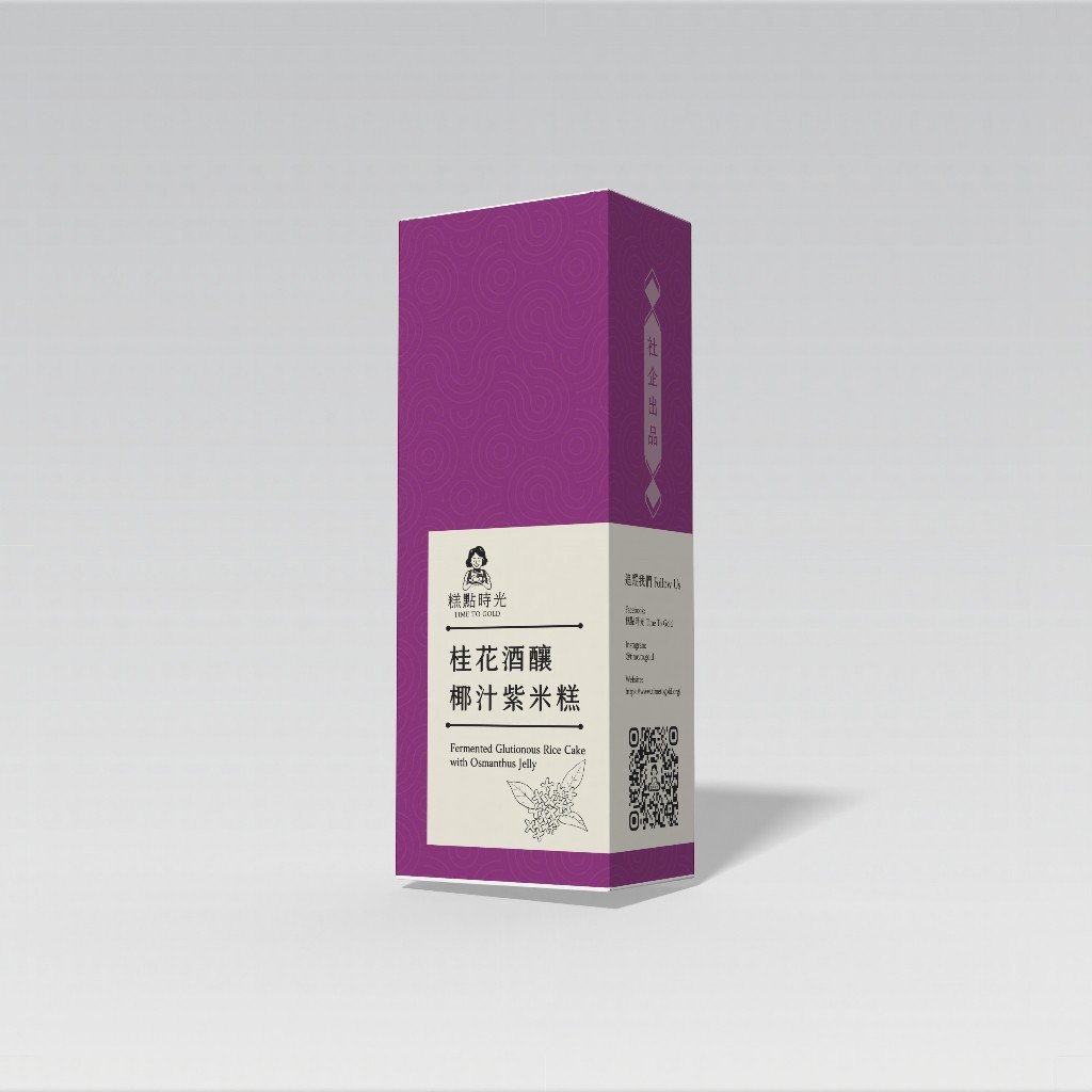 The upper layer features golden osmanthus cake made with premium osmanthus and goji berries, infused with organic round glutinous rice from Taitung, resulting in a pure rice fermentation with a fragrant aroma and sweet rice flavor. The lower layer is a purple rice coconut jelly, crafted from the most nutritious brown glutinous rice fermentation, retaining the bran layer and whole germ, so each bite includes the texture of whole rice wine fermentation.