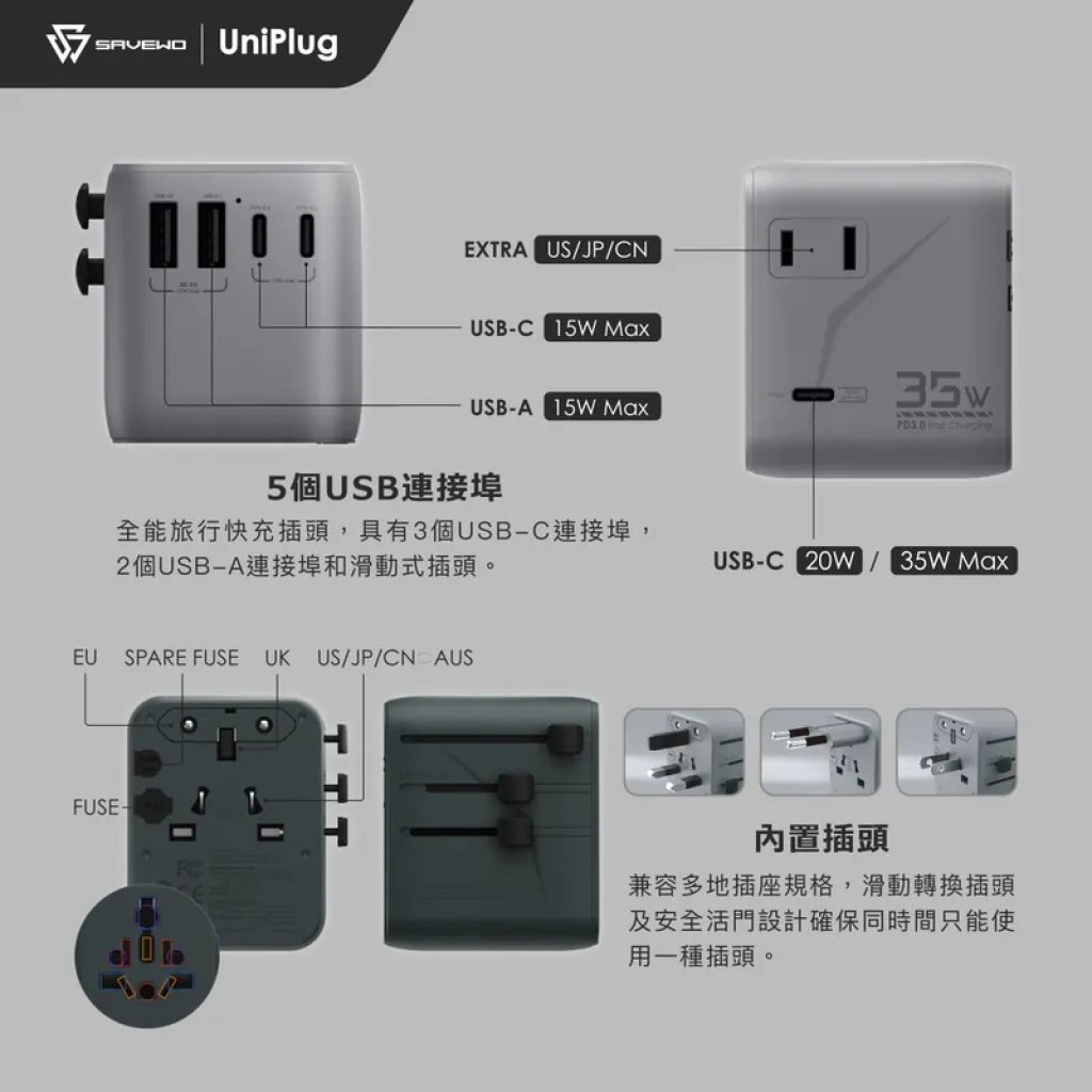 SAVEWO Uniplug 5 Ports 35W is your best charging partner for daily use and travel, helping you to cope with the charging needs of multiple devices easily and travel without worries! ✨