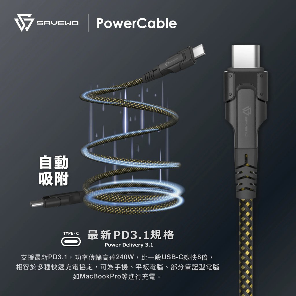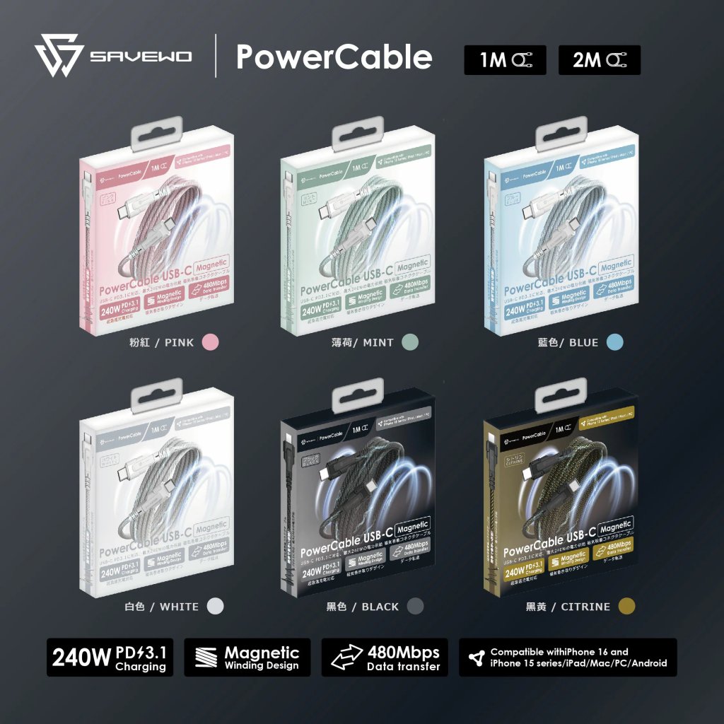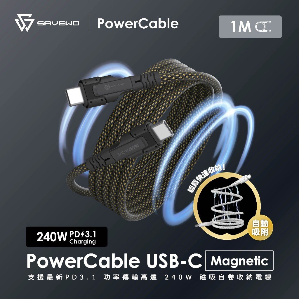 SAVEWO PowerCable USB-C Magnetic Auto-Coil 240W PD3.1 Ultra-Fast Charging Cable