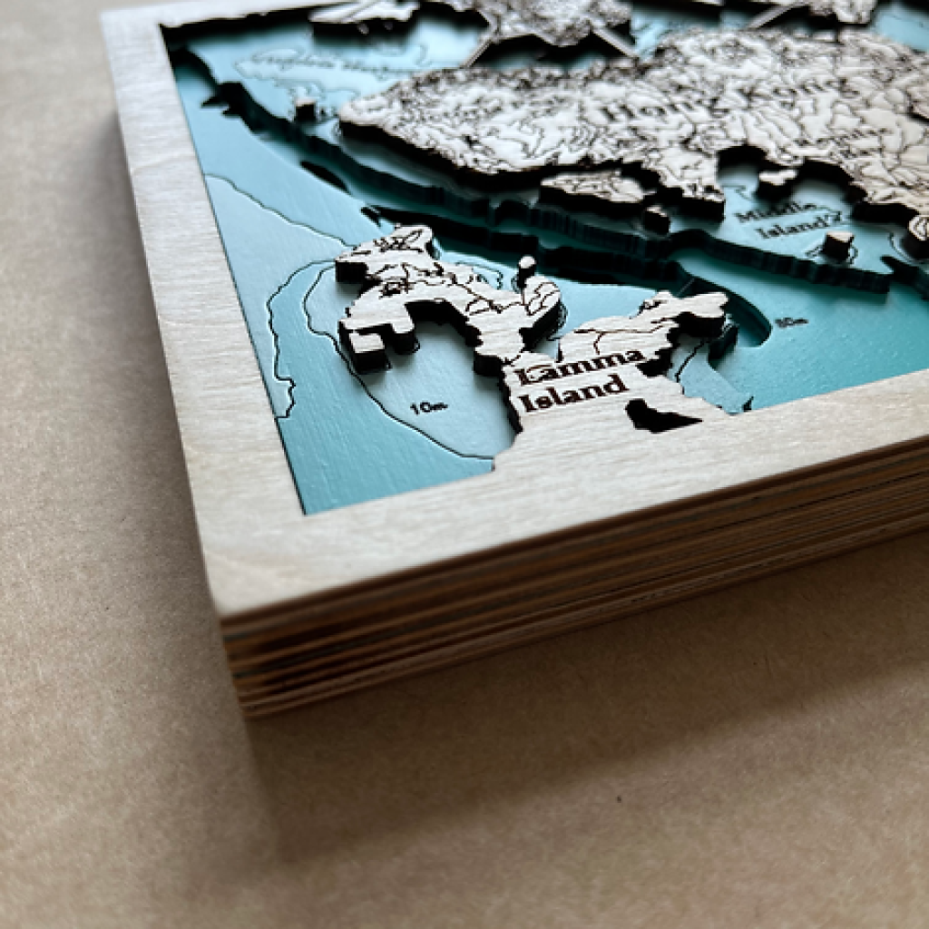 The layers indicating the depth are cut with a laser with the actual depths of water areas, based on bathymetric map data. Each layer of the map indicating a certain depth is engraved and painted with special paints in its own unqiue color, which gives the map an exceptionally powerful visual effect.